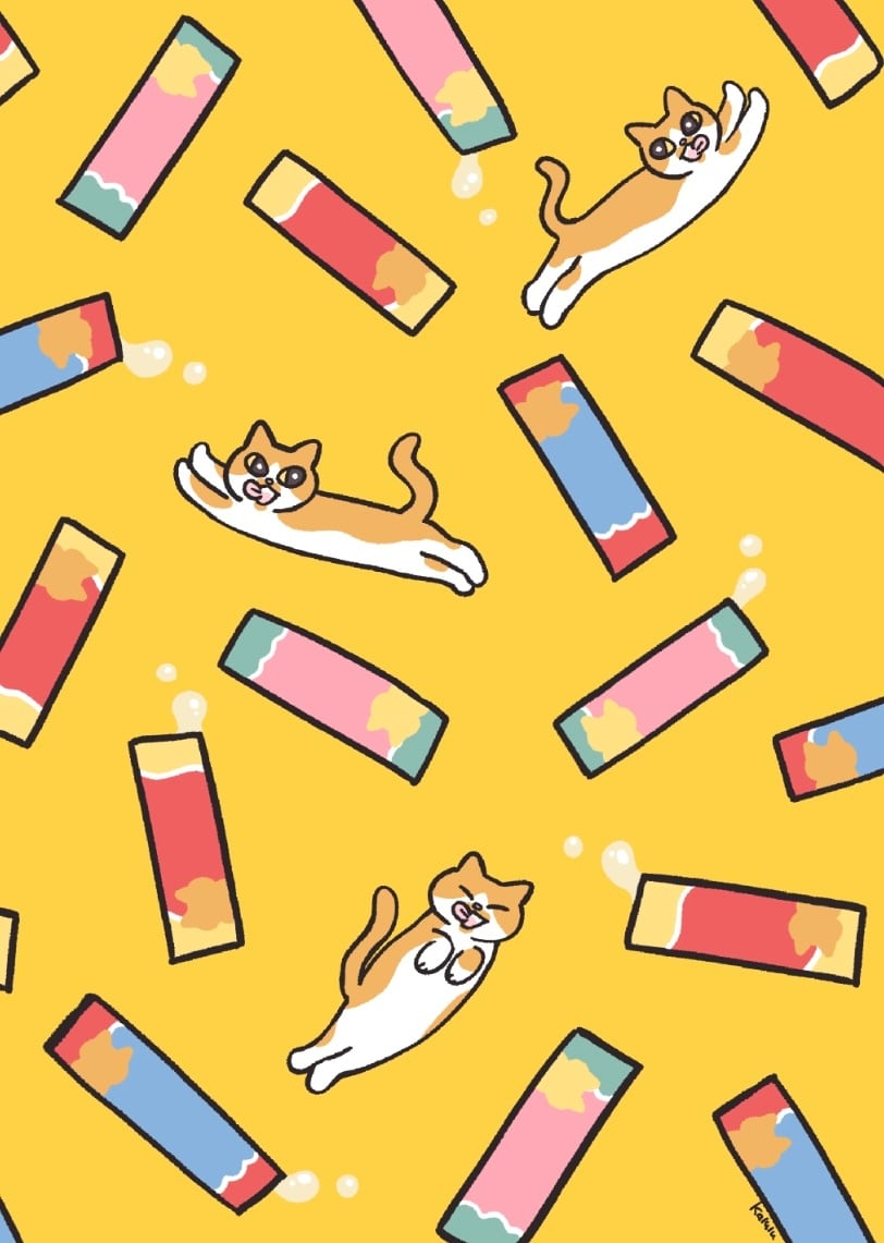 ねこちゃんたちと、だいすきなおやつをぎゅっと詰め込んだデザイン。